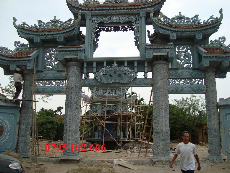 Cổng làng bằng đá thường được làm bằng loại đá xanh đen của Thanh hóa. Tùy kích thước chiều ngang của cổng mà các nhà thiết kế sẽ tính toán yếu tố chịu lực của các mái đao cho phù hợp. Một số nơi cổng có diện tích lớn thường phải kết hợp gia cố bê tông cốt thép để tăng cường chịu lực, móng cổng do vậy cũng phải được khảo sát tính toán hết sức chi tiết.