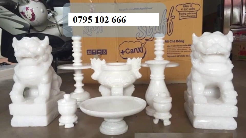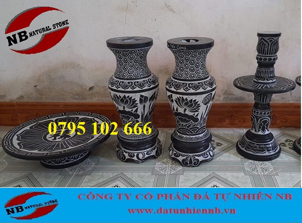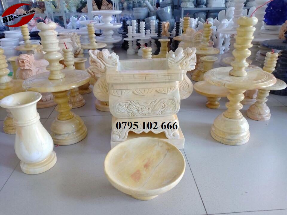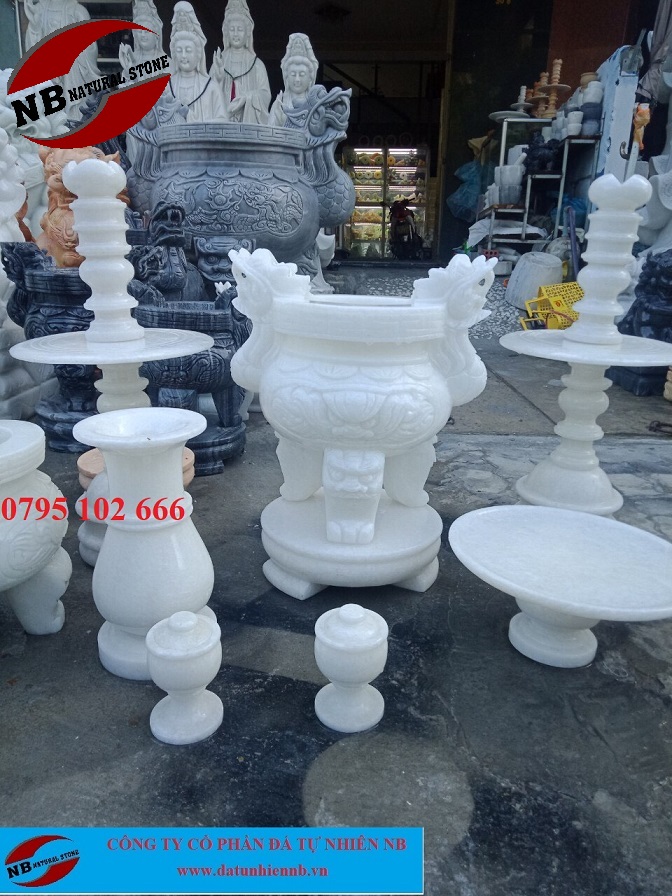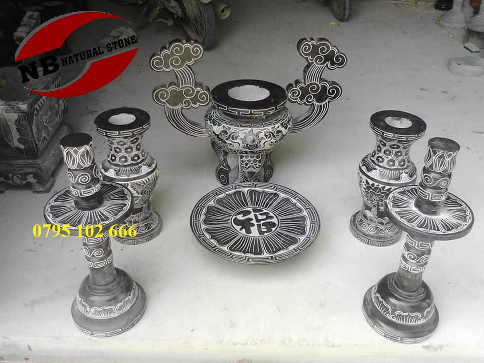 Bộ đồ thờ bằng đá được sản xuất tại làng đá mỹ nghệ Non nước với các mầu sắc trắng, vàng, đen. 100% sản phảm được làm bằng đá tự nhiên liền khối, không om nứt và chắc chắn. Một bộ đồ thờ gồm bát nhang đá, lọ hoa đá, mâm bồng đá, chân nến đá, ống hương đá, hũ gạo bằng đá, hũ muối bằng đá, hũ nước bằng đá.