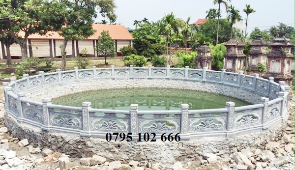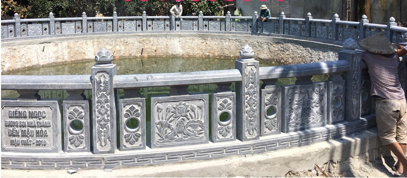 Kích thước lan can đá thường cao từ 76 đến 81cm tùy kiểu loại, đầu trụ có thể để đèn đá hoặc hoa sen theo phật giáo. Họa tiết hoa văn trên lan can giếng đá cũng khá phong phú từ linh vật đến cây cối non sông như Long Ly Quy Phượng, Tùng Cúc Chúc Mai hay đơn giản là trạm hoa sen.
