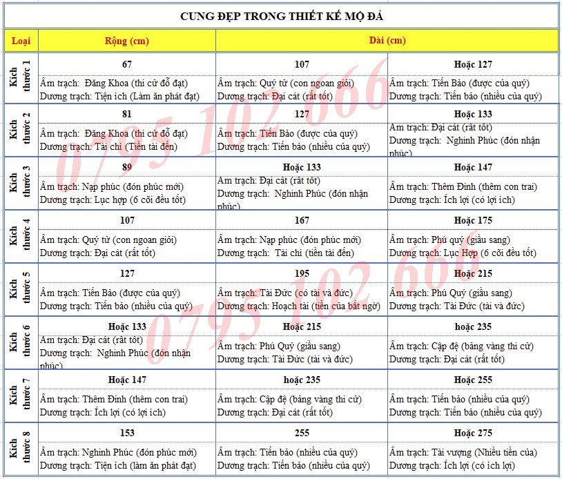 Kích thước mộ đá chuẩn phong thủy phải theo thước lỗ ban. Trong bộ thước lỗ ban chúng ta chọn loại thước 38.83cm được sử dụng trong việc đo đạc để xây dựng các phần mộ, là loại chuyên dùng cho tâm linh để làm căn cứ. Xin giới thiệu một số cung trong bộ thước này.