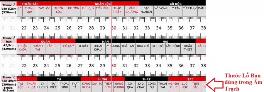 3. Thước lỗ ban loại 38.8cm (380mm). Là thước tâm linh, thước này chuyên dùng đo kích thước các hạng mục như đồ thờ, mộ phần, kệ thờ, ban thờ, câu đối hoành phi, các lư hương, đèn đá, bàn lễ, cột cổng... các công trình tâm linh.