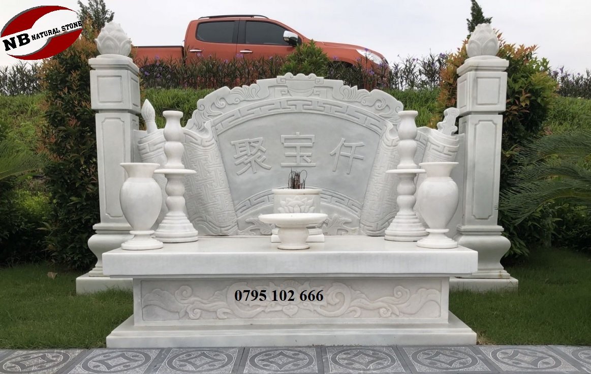 Mẫu cuốn thư đá trắng cùng bàn lễ và bộ đồ thờ
