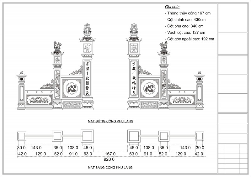 Thiết kế kích thước trụ cổng lăng mộ là việc làm hết sức quan trọng đòi hỏi phải được thực hiện bởi người có kinh nghiệm, kiến thức và con mắt thẩm mỹ. Kích thước trụ cổng phụ thuộc vào diện tích lăng, chiều ngang lăng mộ và kiến trúc các hạng mục liên quan. Đối với các lăng mộ có chiều ngang rộng và có chiều sâu thì cổng phải lớn và ngược lại, thiết kế cổng phải phù hợp với các hạng mục khác để tránh quá to, quá nhỏ hoặc không cân đối. Kích thước cổng phổ biến nhất hiện nay thường thấy trụ 450 x 450mm (thân trụ 300 x 300mm) và thường cao trên 2m, tất nhiên kích thước này phải theo chuẩn thước lỗ ban. Xin giới thiệu một vài thiết kế cổng để quý vị tham khảo.