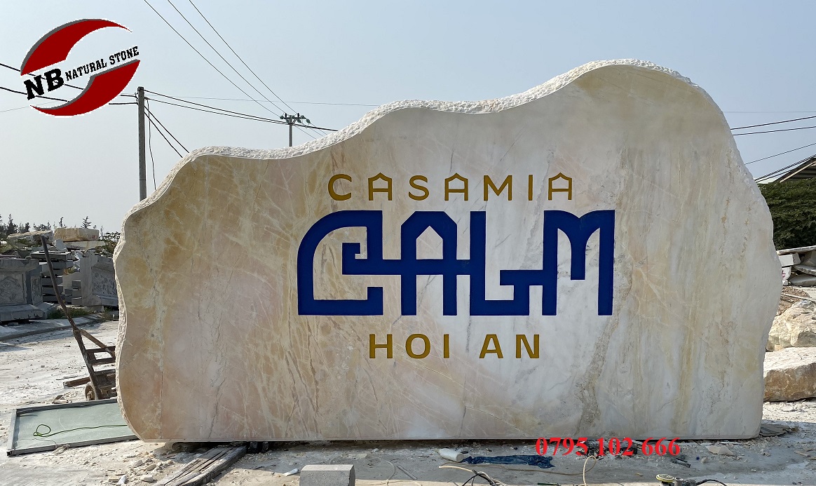 Biển hiệu đá tự nhiên nguyên khối mầu vàng. Đây là dòng đá Marble khai thác tại Nghệ An/ bình định. Hợp với người mệnh Kim.