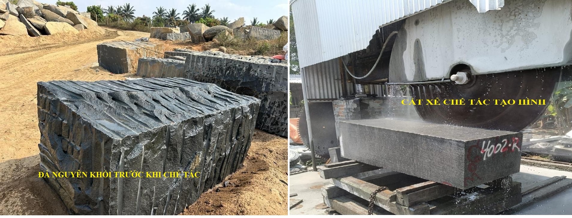 ► Chế tác xẻ thô: Mộ đá kim sa nguyên khối được chế tác từ các khối đá nguyên khối. Sau khi hoàn thành khai thác tại các mỏ đá tự nhiên, từng khối đá lớn được đóng kiện trong các container và vận chuyển bằng tầu biển để nhập khẩu về Việt Nam thông qua các đơn vị nhập khẩu. Từ đây, đá được đưa về các xưởng chế tác, các máy cưa cỡ lớn sẽ xẻ nhỏ ra theo thiết kế cụ thể và đánh bóng tự nhiên không dùng hóa chất.