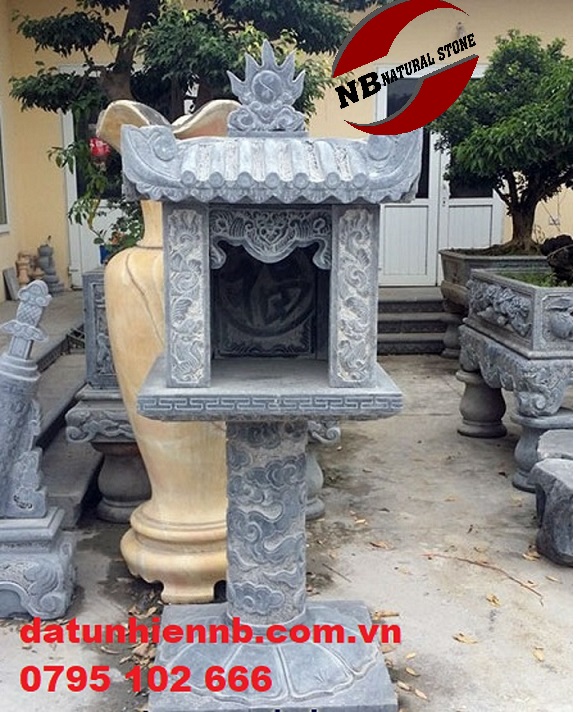 Cây hương đá có mái che: phần trên thường được thiết kế như một ngôi miếu nhỏ. Trên phần mái có thể làm 1 mái, 2 mái và cũng đều được chạm khắc các đường nét tùy theo mục đích của gia chủ. Phần thân và đế kết cấu giống như cây hương không mái che. Kích thước cây hương đá có mái do có thêm phần mái và vách nên kích thước bàn thiên sẽ rộng hơn. Mặt vuông: 81x81cm, 89x89cm, 91x91cm, 107x107cm. Cao 107cm, 117cm, 127cm.