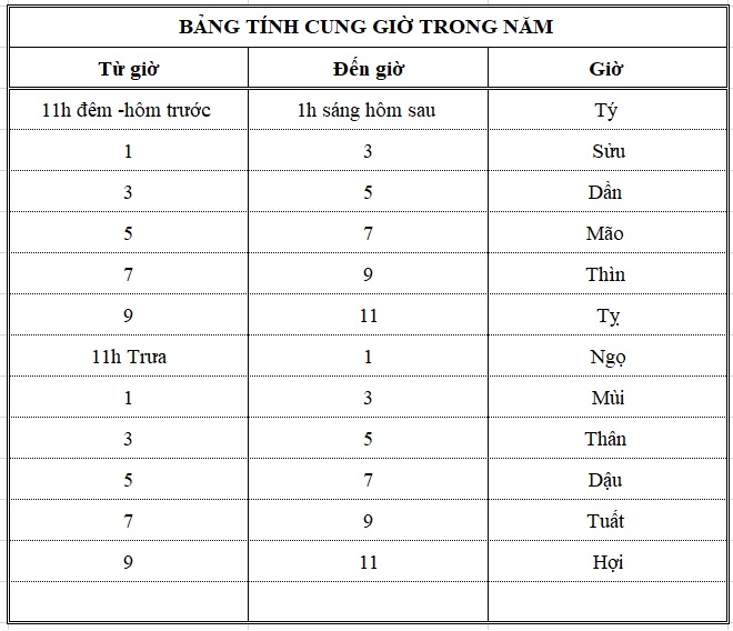 4) Tính giờ mất: Khở đầu từ cung Ngọ (ngay sau cung ngày mất tính ở trên). Tính giờ mất phức tạp hơn một chút do chúng ta phải biết chính xác giờ mất. Một ngày có 24h và được chia thành 12 cung, như vậy 2 tiếng là một cung và khởi đầu là 11h đêm hôm trước đến, cụ thể.