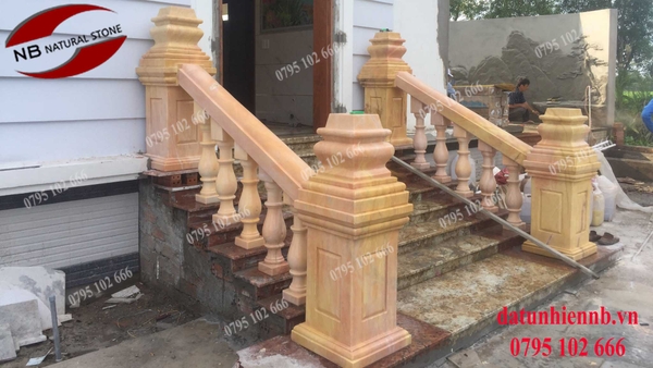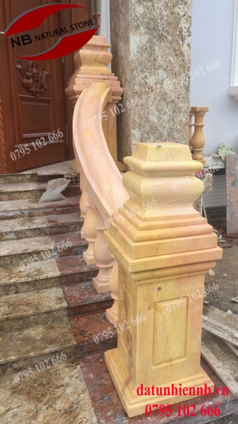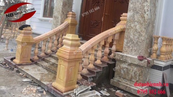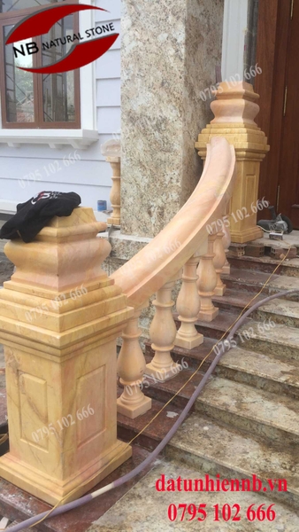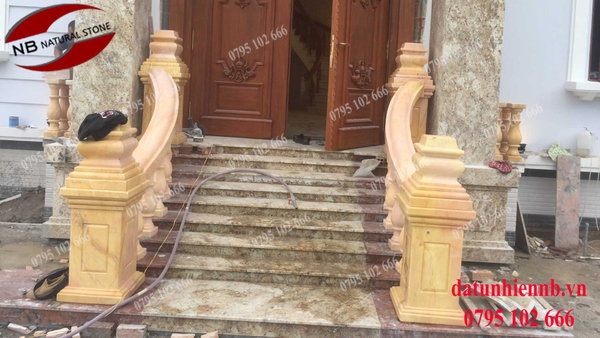 Toàn bộ trụ đá vàng được làm từ đá vàng nguyên khối của vùng nghệ An, tay vịn, trụ và con tiện đều được làm nguyên khối, không cắt ghép.