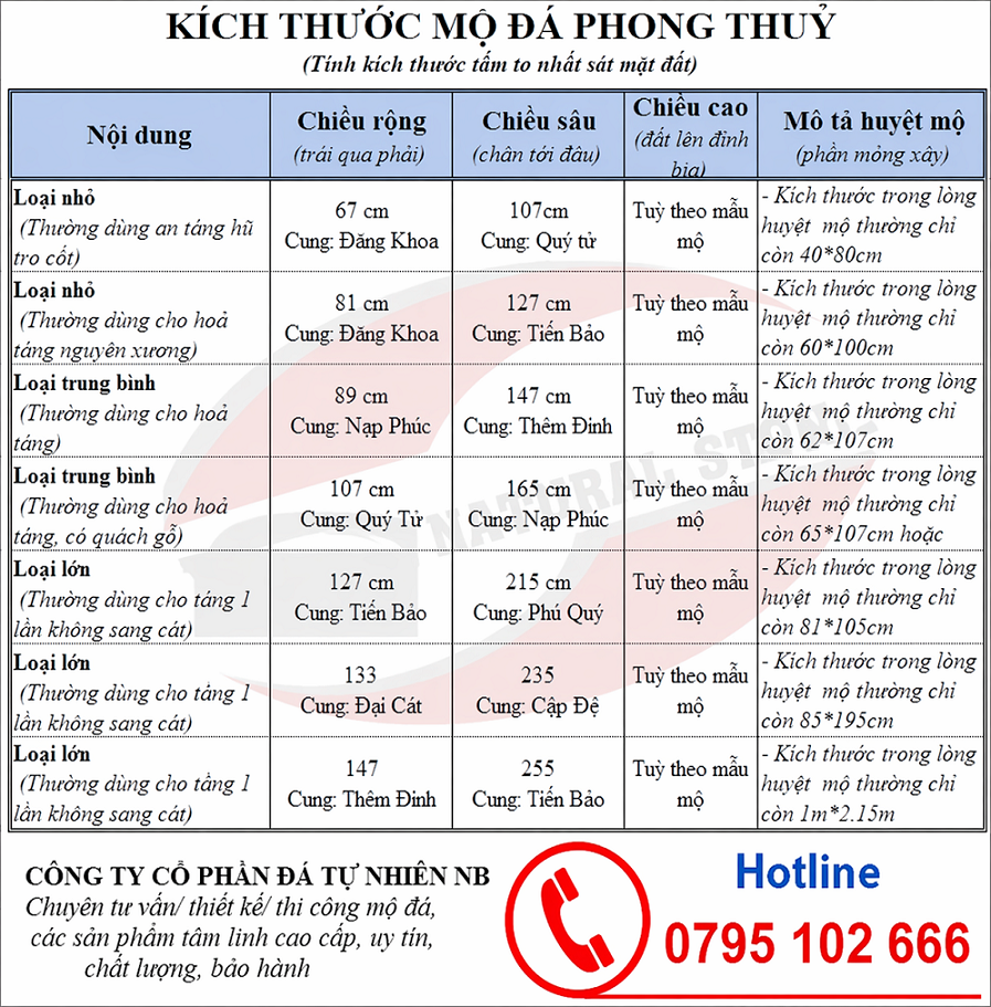 Bằng kinh nghiệm và những căn cứ thước lỗ ban, Datunhiennb chúng tôi xin đưa ra bộ kích thước mộ đá tiêu chuẩn phổ biến hay gặp nhất hiện nay. Bộ kích thước này chỉ mang tính chất tham khảo, quý vị có thể lựa chọn thêm trong bộ thước lỗ ban cụ thể.