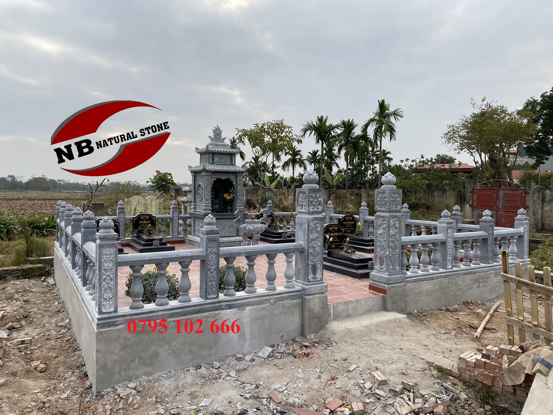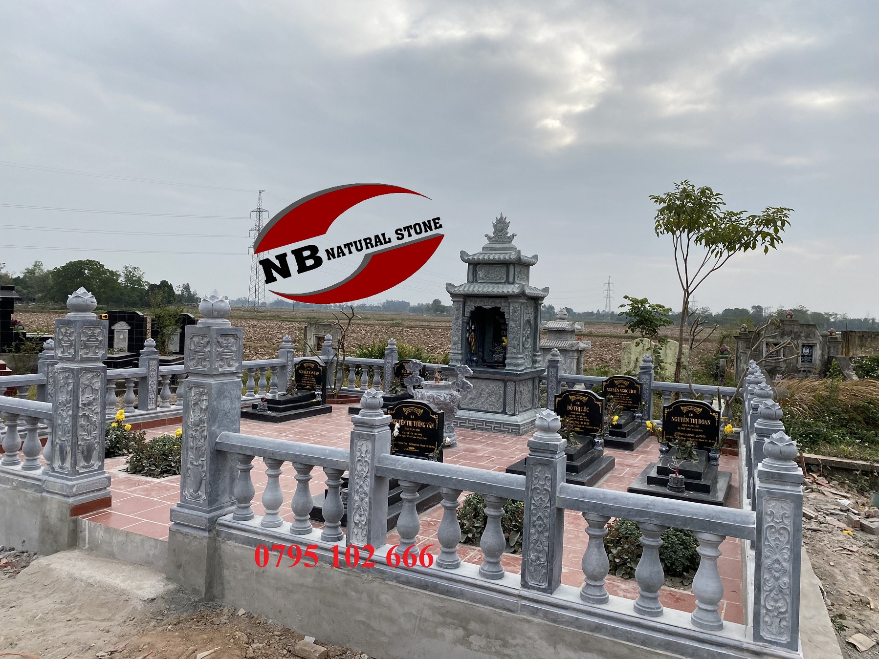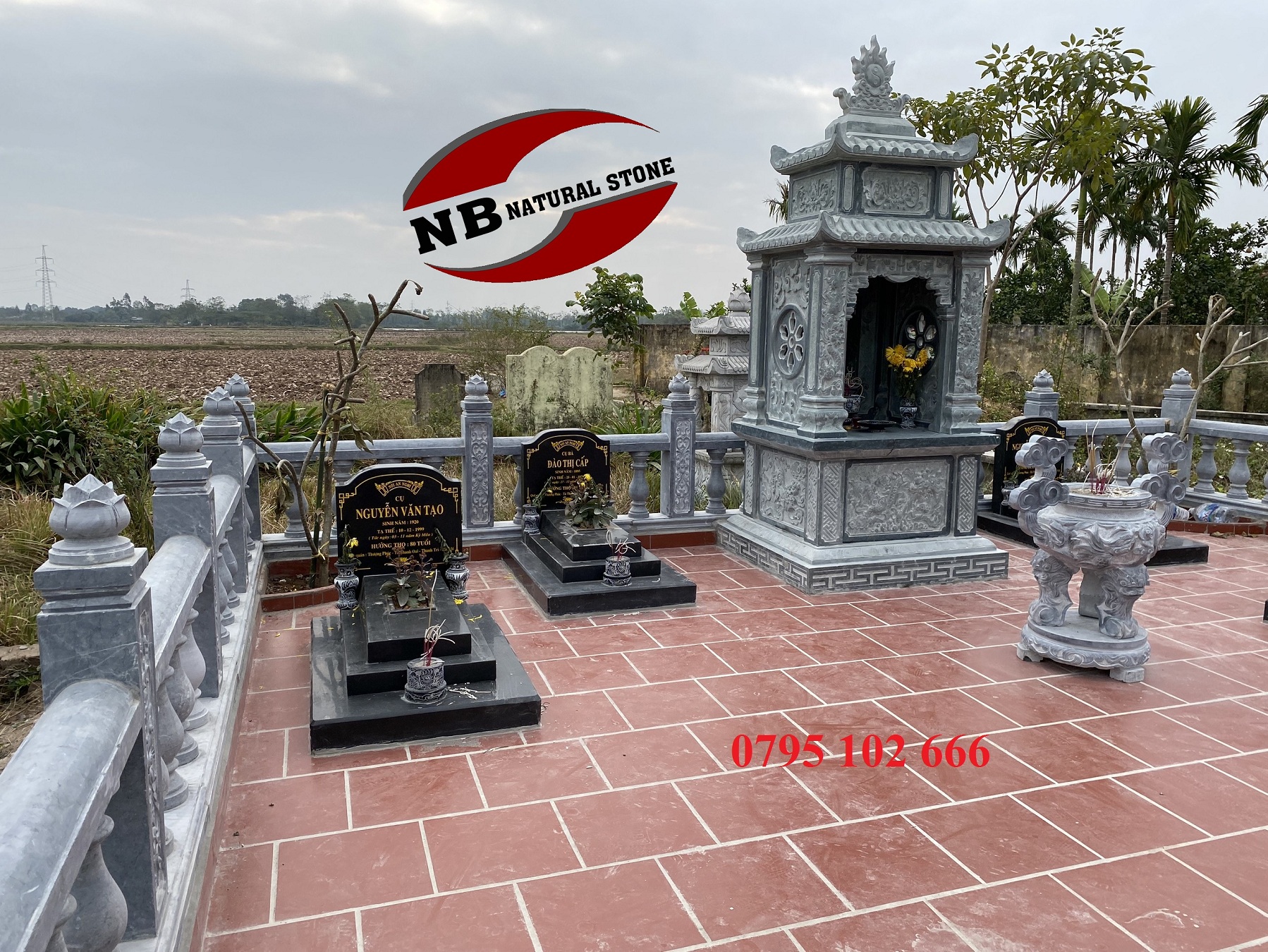 Để có 1 khu lăng hoàn chỉnh, ngoài 6 ngôi mộ đá granite mà Công ty chúng tôi cung cấp, còn có lăng thờ đơn làm bằng đá xanh rêu, lan can con tiện và lư hương tai mây bằng đá xanh đen. Đây là 2 loại đá chủ yếu của Thanh Hóa, đá xanh rêu là loại đá có tính thẩm mỹ cao, có cấu tạo đặc biệt, màu sắc có màu xanh của rêu, rất dai, thích hợp với các sản phẩm tâm linh có nét đẹp truyền thống, cổ điển.