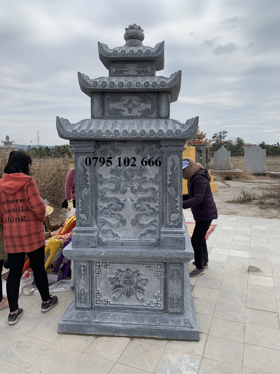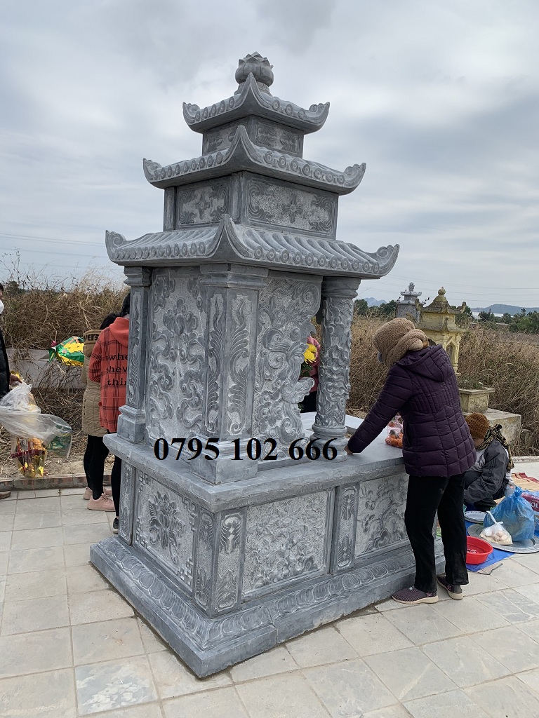 Thiết kế mộ mái đao 3 mái kích thước ngang 1.07m sâu 1.95m theo đúng kích thước lỗ ban với chiều cao 3.15m. Mộ được thiết kế và chế tác bằng đá liền khối với chất liệu đá xanh đen Thanh hoá loại 1, được lựa chọn kỹ trước khi chế tác nên đảm bảo được độ dai, độ cứng của đá, chịu được tác động của gió mưa.