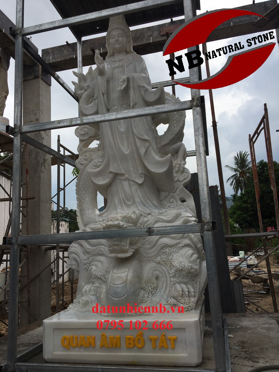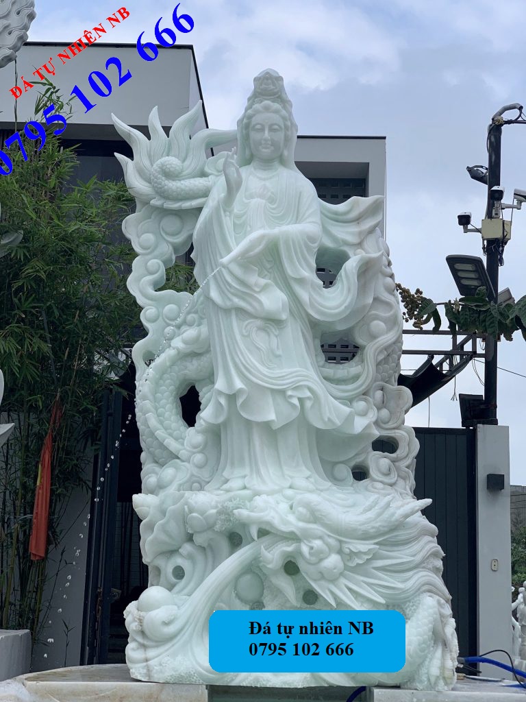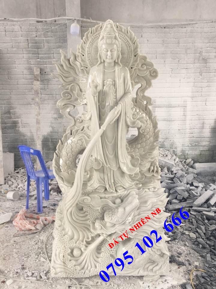 Tượng phật Bà quan âm cưỡi rồng hay còn gọi là phật Bà trụ long quá hải bằng đá cẩm thạch là một trong những tượng phật đẹp được khá nhiều phật tử yêu thích. Ngài cưỡi trên lưng rồng, tay bắt ấn rất uy phong và hiền hậu. Chúng tôi đã thi công và lắp đặt hoàn thiện tượng ngài cao 3.5m tại Cam ranh - Khánh hòa cùng một loạt tượng các chú tiểu đá.