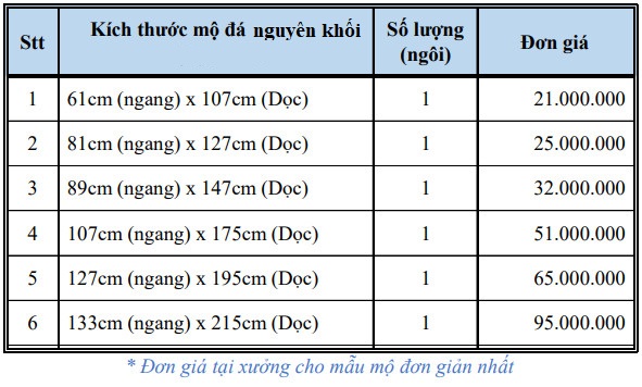 ► Về nguyên tắc, mộ đá tự nhiên nguyên khối tính giá theo khối lượng đá (m3) đơn vị đá tiêu tốn để sản xuất. Do vậy, mộ càng to càng tốn đá và giá thành sẽ cao hơn so với mộ nhỏ.