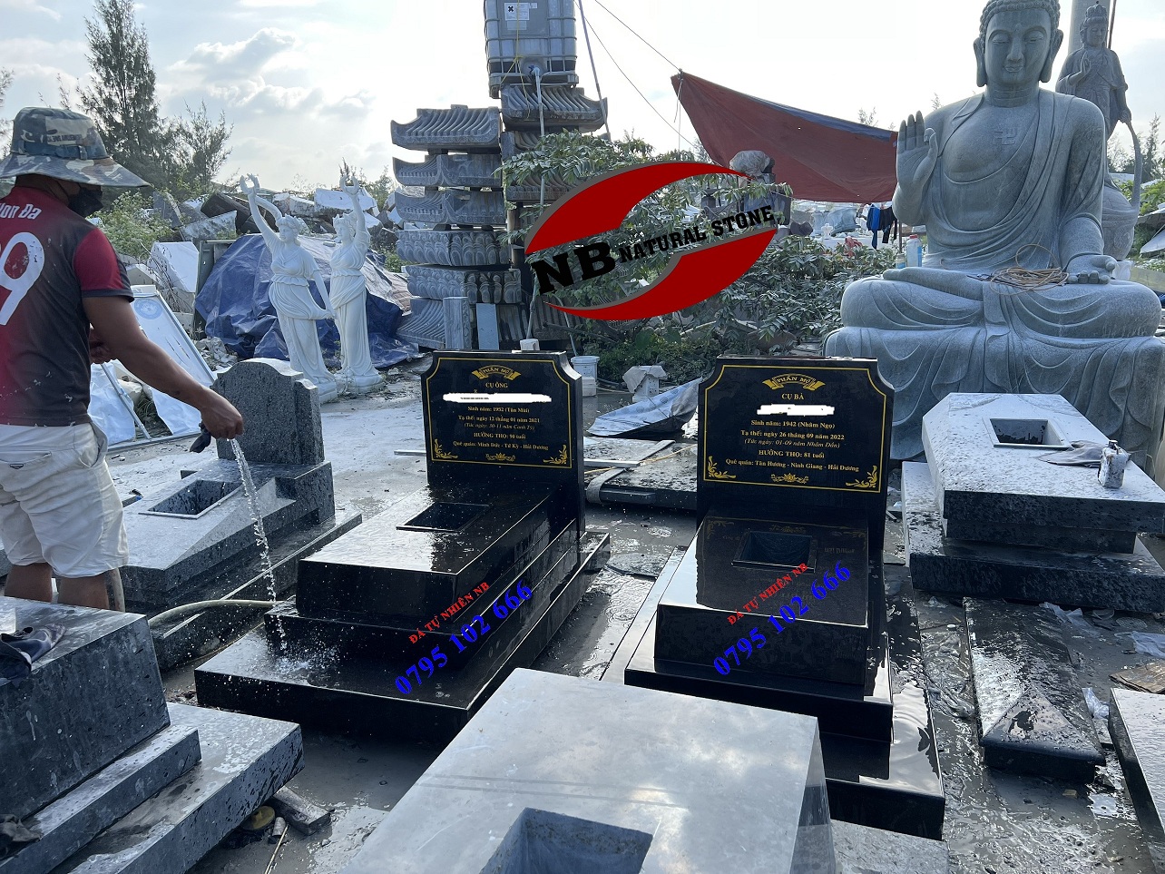 Cuối cùng là 2 ngôi mộ đá hoa cương với kiểu dáng hiện đại và sang trọng, đá được sử dụng là đá Granite đen Bình Định nguyên khối bởi khả năng chịu nhiệt tốt và không bị thấm nước. Do đá rất cứng nên khi chế tác lên sản phẩm mộ đá có độ bóng cao, sau nhiều năm đưa vào sử dụng thì chất lượng sản phẩm vẫn không có nhiều thay đổi so với ban đầu.