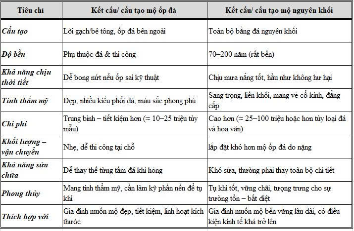 Mộ đá nguyên khối và mộ ốp đá đều được gọi chung là mộ đá, mỗi loại sử dụng những phương pháp thi công riêng và đều có ưu nhược điểm riêng. Việc lựa chọn loại mộ đá nào là tuỳ thuộc vào mỗi gia đình, tuỳ thuộc vào mỗi quan niệm riêng... dưới góc nhìn kỹ thuật và kinh nghiệm của người sản xuất, chúng tôi xin chia sẻ những phân tích thực tế qua bài viết sau đây.