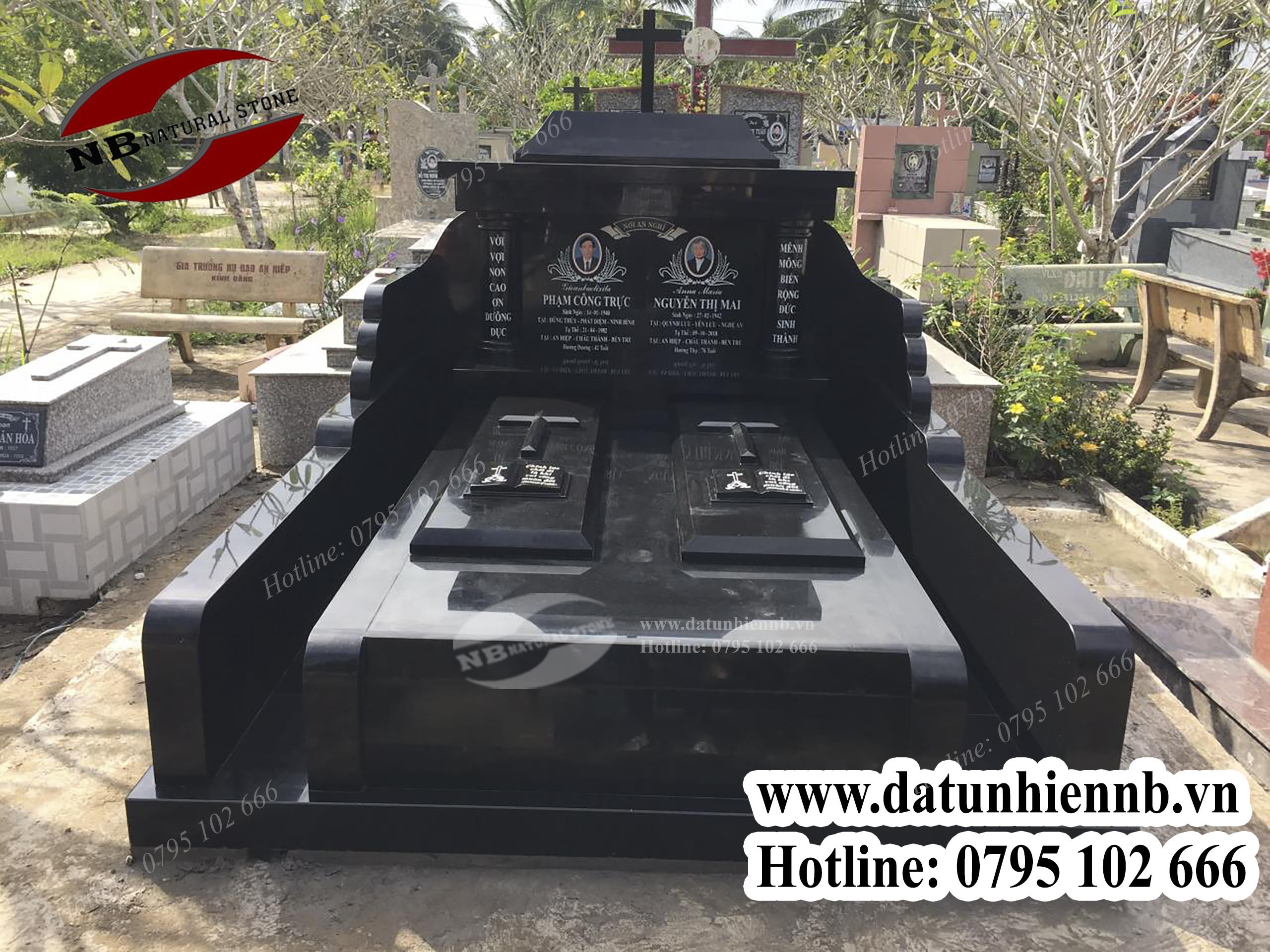 Mộ đá nguyên khối- Mộ đôi công giáo đá xanh đen- MĐ 08