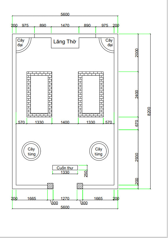 ► Cây xanh và vật phẩm trong lăng cũng nên có xu hướng thấp dần ra phía cổng để tạo sự tôn nghiêm của chính lăng thờ chung cao nhất. Tạo điểm nhấn cho trung tâm của khu lăng là long đình và hai mộ cao nhất.