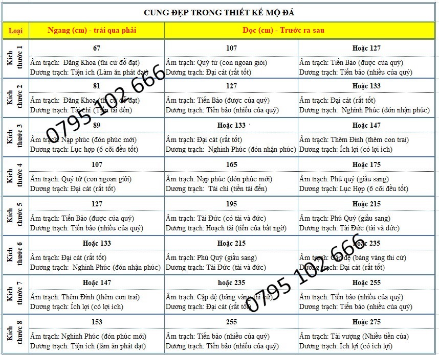 Mộ đá trắng cẩm thạch cũng tuân theo các quy tắc tâm linh chung do vậy kích thước phải tuân thủ theo chuẩn thước lỗ ban, đây là bộ thước phong thủy nổi tiếng Trung quốc đang lưu hành rộng rãi ở nước ta. Cụ thể bộ thước này có 3 loại và trong tâm linh mộ đá dùng loại 3 (thước Đinh Lan):
