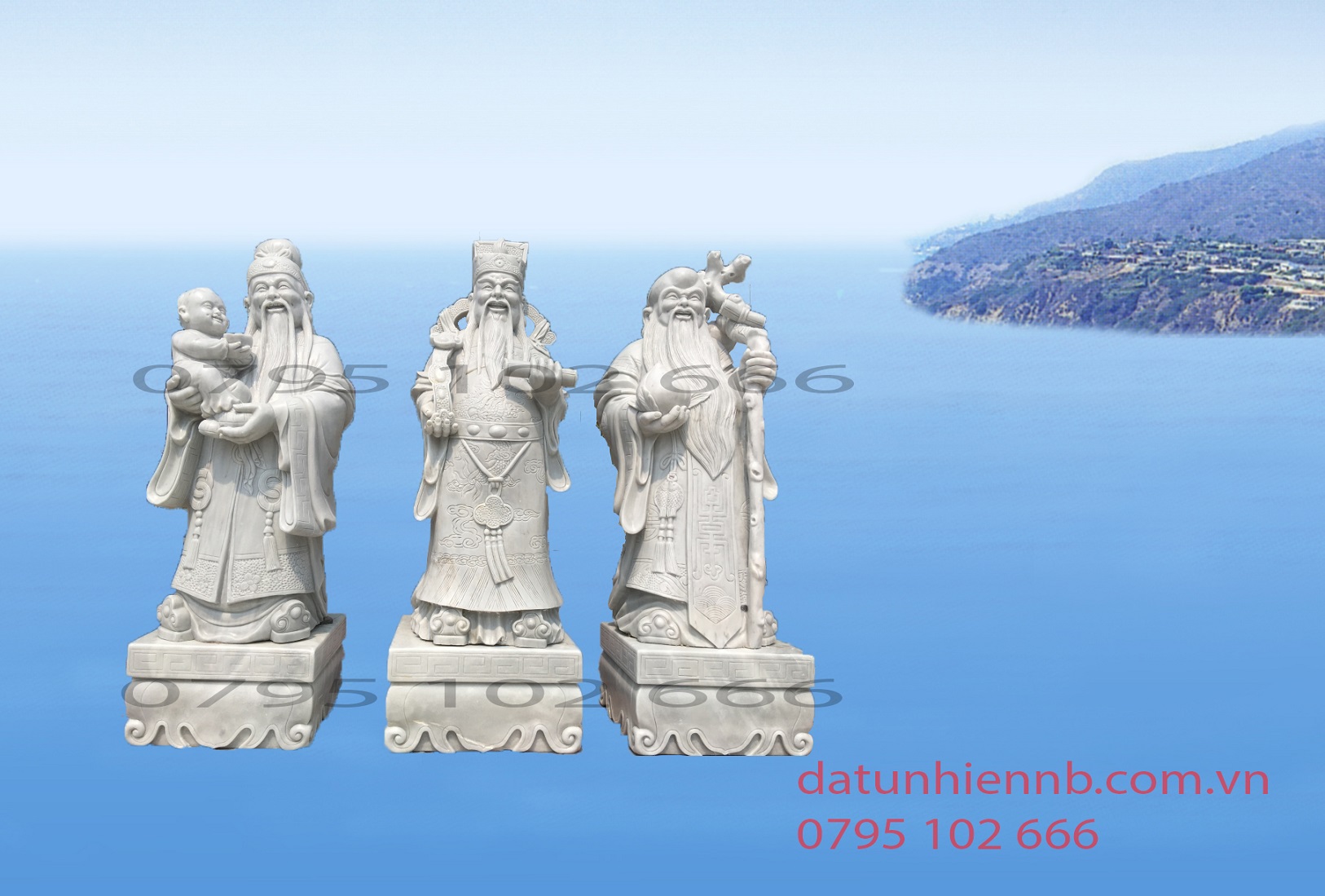 Tượng Phúc Lộc Thọ bằng đá được điêu khắc bằng đá tự nhiên và nguyên khối, có thể được điêu khắc bằng nhiều loại đá khác nhau nhưng phổ biến nhất là đá cẩm thạch (màu trắng, màu xanh, màu cà rốt) và đá Granite (màu đen, màu đỏ).